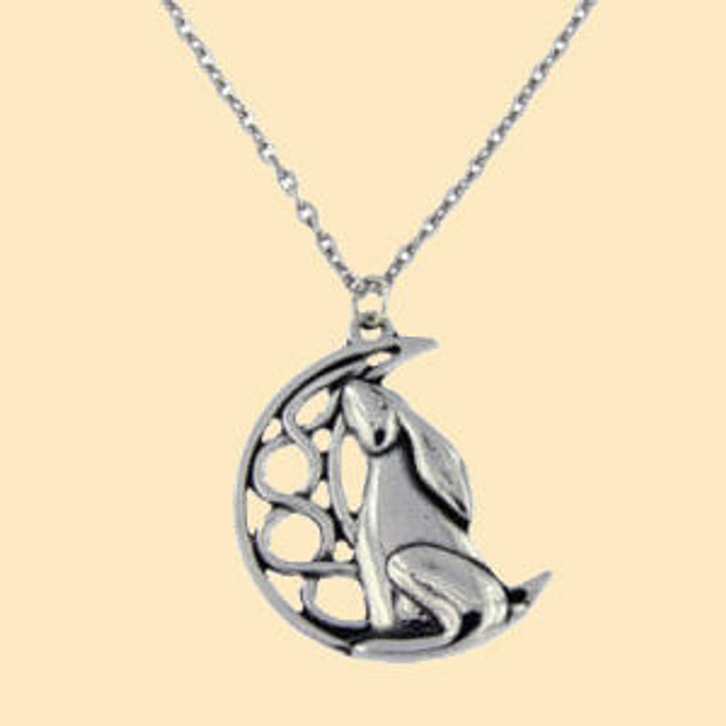 Moon gazing hare pendant – Pewter openwork pendant on 45cm rhodium-plated trace chain.